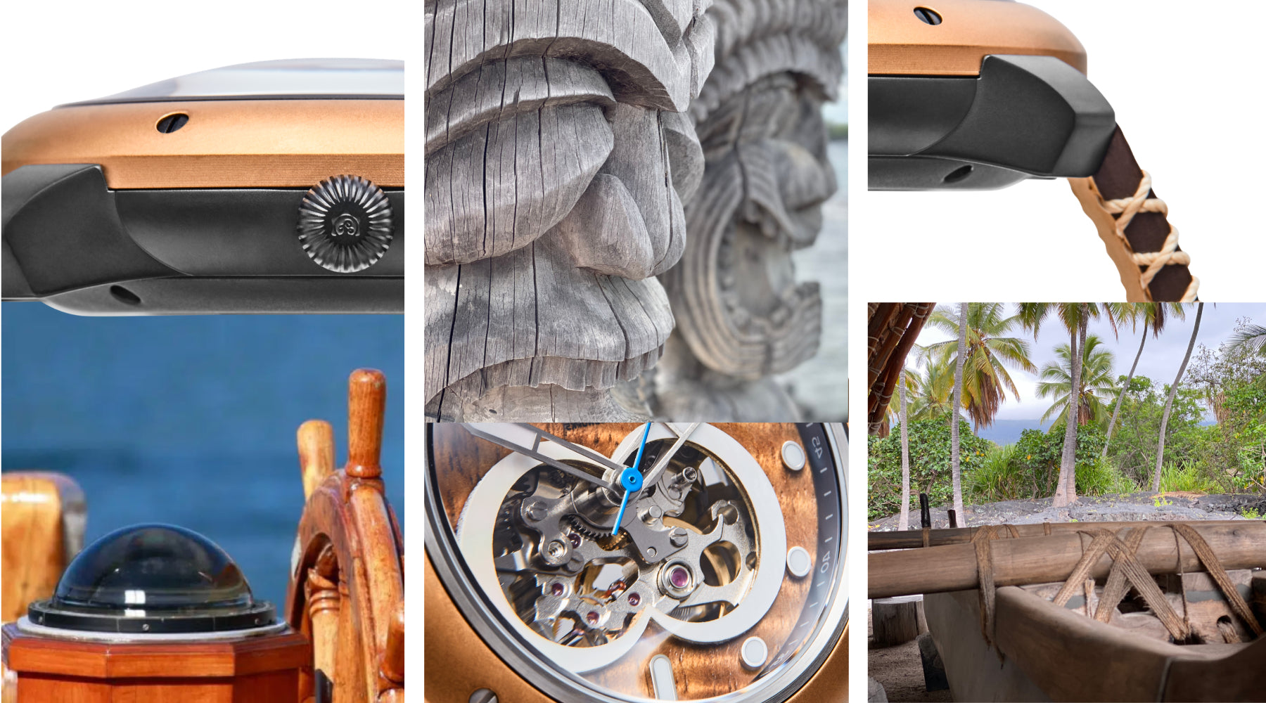 An incredibly domedย sapphire crystal creates a bold look by continuing the arc of the rounded design and harkens back to the binnacle compass housing of the Matson tall sailing ships. The top quality full grain leather band brings in the stitching details of a voyage of a much earlier time connecting alma to Koa canoe.