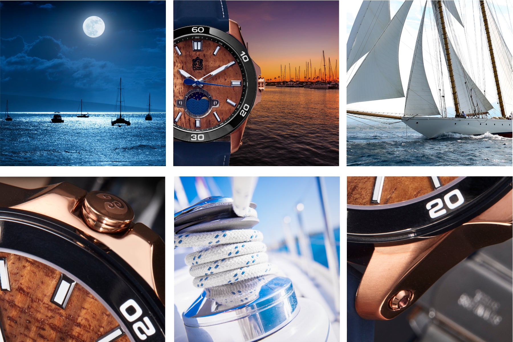 The sailing theme continues with the moon-phase window recreating the setting of the Mahealani moon over the Pacific. The crown is shaped after a self-tailing winch on a sailboat and the second hand represents the steering paddle if your sailing should be of the outrigger canoe variety.ย It's these memories that this design pulls from.
