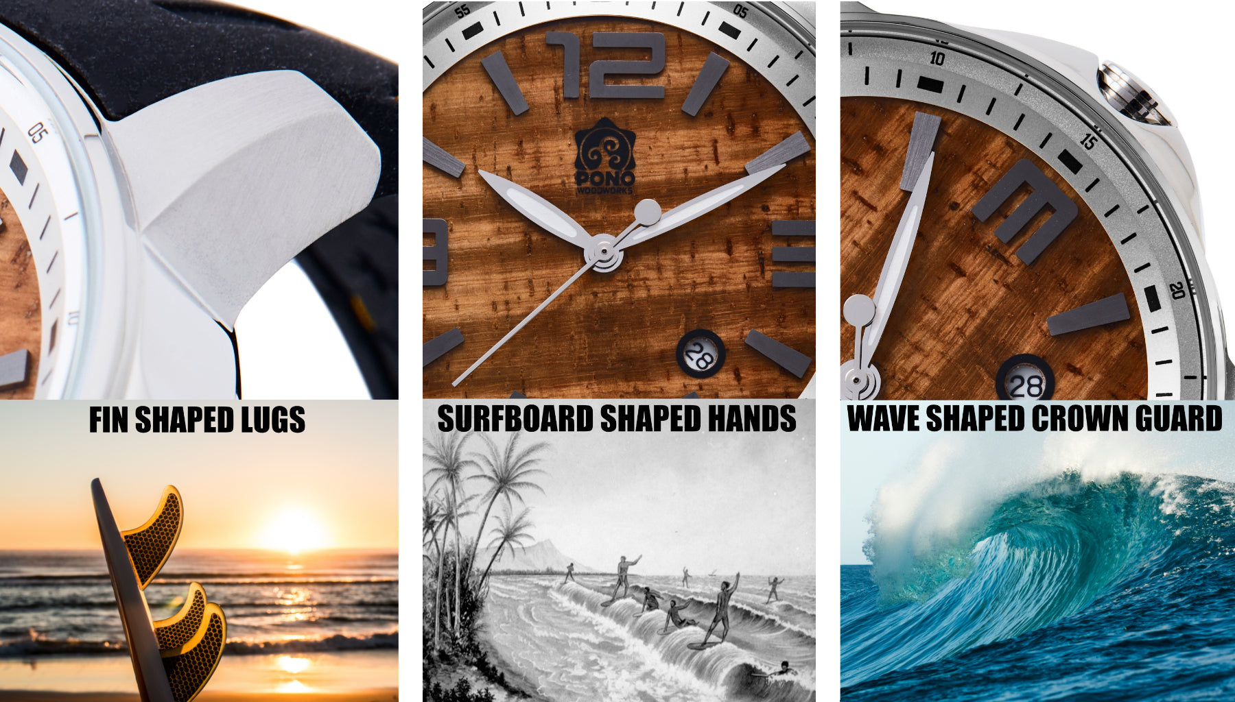 The Surfrider's design incorporates details that bring to mind Hawaii's favorite pastime...and possibly best invention (I might be biased). My intention for the Surfrider wasย to excel no matter the venue...It looks on pointย dressed to the 9's or dressed down to your boardies. Itย can accompany you out to the lineup or into the boardroom (surfboard preferably).ย The design details drawย from the sport of kings...check out the details below.