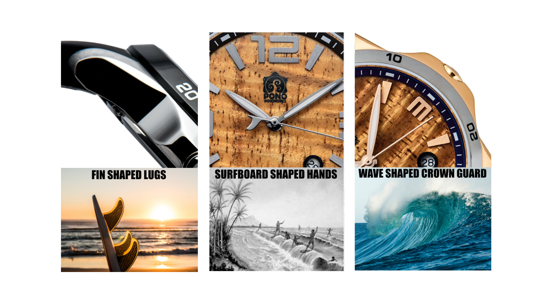 The Surfrider's design incorporates details that bring to mind Hawaii's favorite pastime...and possibly best invention (I might be biased). The shape of the hour and minute hands are drawn from the two most famous surfboards...Duke Kahanamoku and Greg Noll's. The second hand is the classic longboard silhouette and the crown protector is the vision of a perfect A-frame wave. The details are an ode to the sport of kings...check them out below.