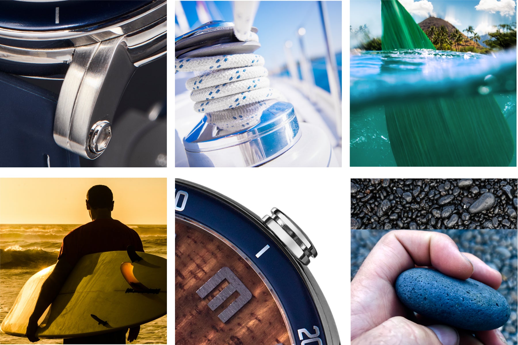 Of course we color matched the turnableย bezel toย the color of the Pacific Ocean at myย favoriteย spot outside of Kona. The rounded shape draws from the lava rock beach stones found around Maui and the Big Island.ย The crowns shape is inspired by the winches on a sailboat and is inset to prevent rubbing on your hand. Finally, our best "curly" grained Koa wood, hand finished in our shop in Honolulu, ensures the face becomes the crowning jewel.