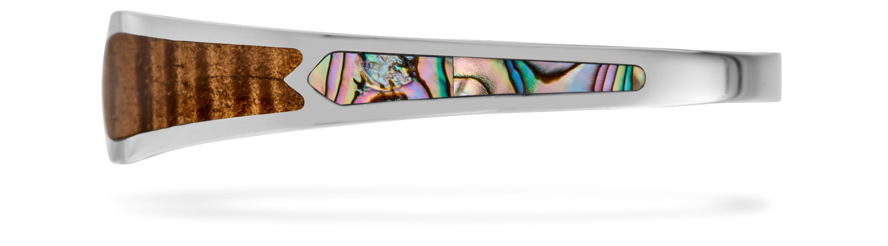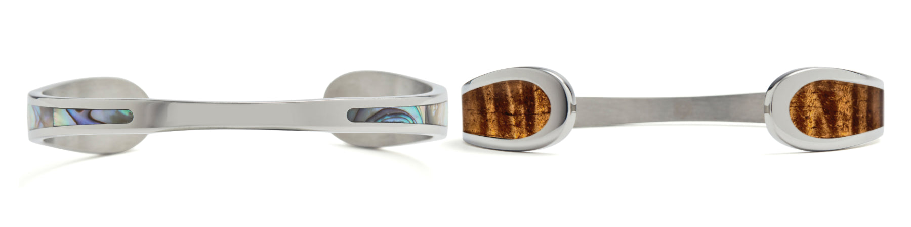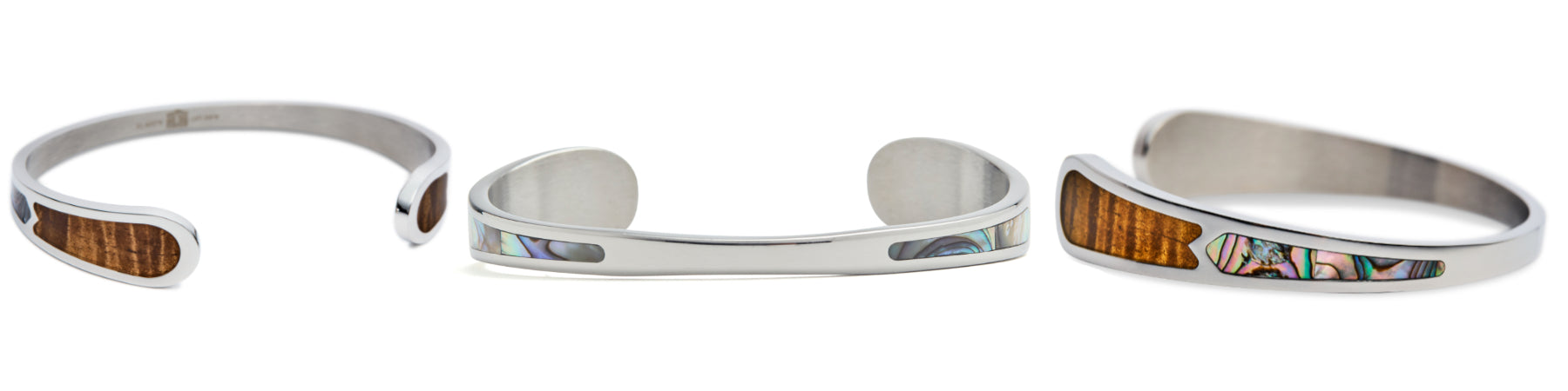 Our Eternity Koa Cuff design showcases the ocean and land (abalone and Koa Wood) wrapped in an artfully stylized infinity design that accentuates the elements and expresses your lasting commitment. ย Koa only grows in Hawaii and was once reserved for royalty.ย It was used for the first surfboards, warrior's weapons and the outrigger sailing canoes that explored the Pacific.ย It's a cultural anchor and it's that sense of exploration that we want to instill in our designs.ย